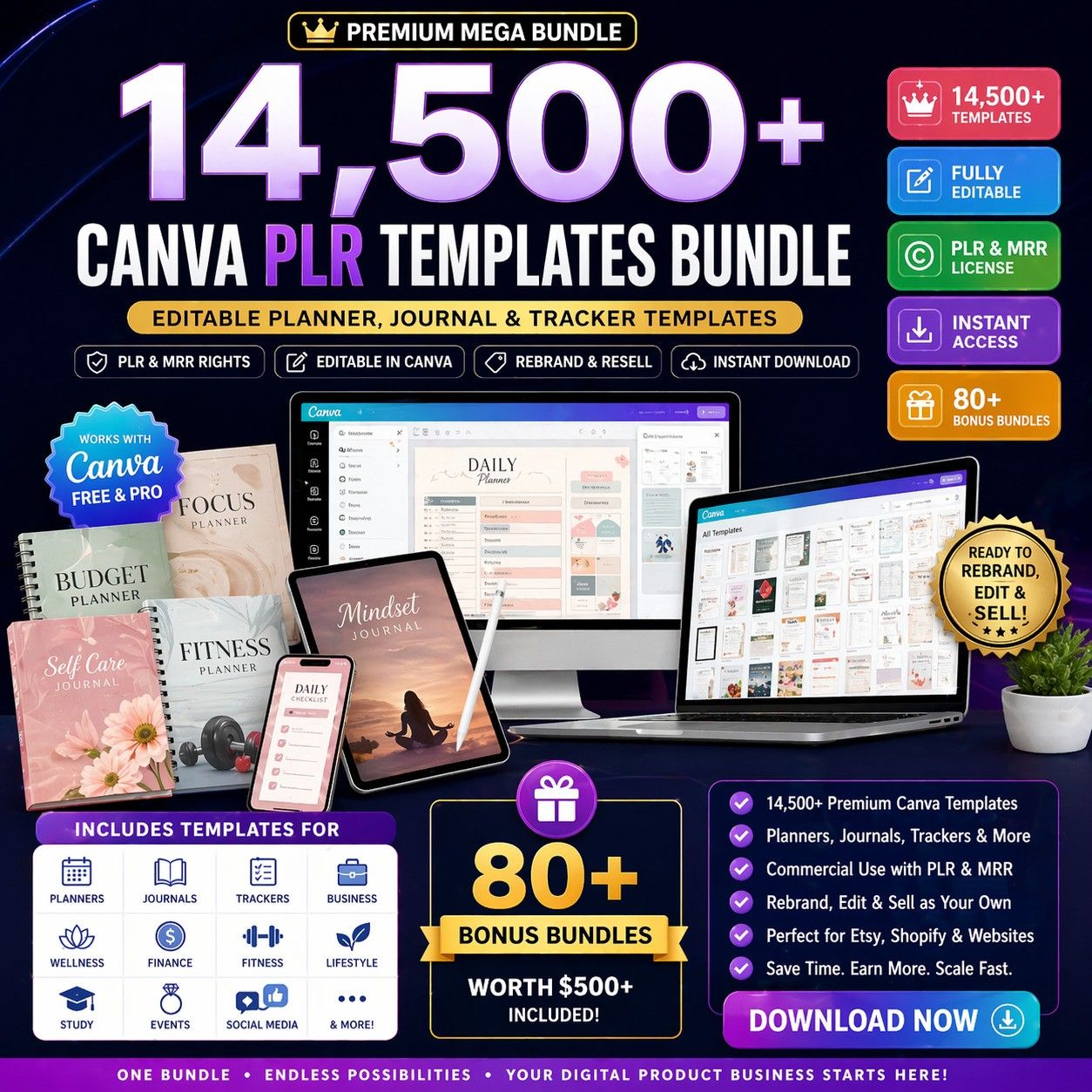 14,500+ Canva PLR Templates Bundle | Editable Planner, Journal & Tracker Pack | PLR MRR Resell Rights Digital Products