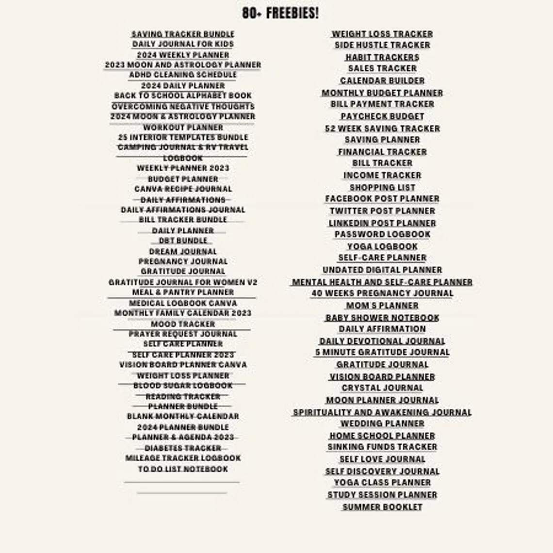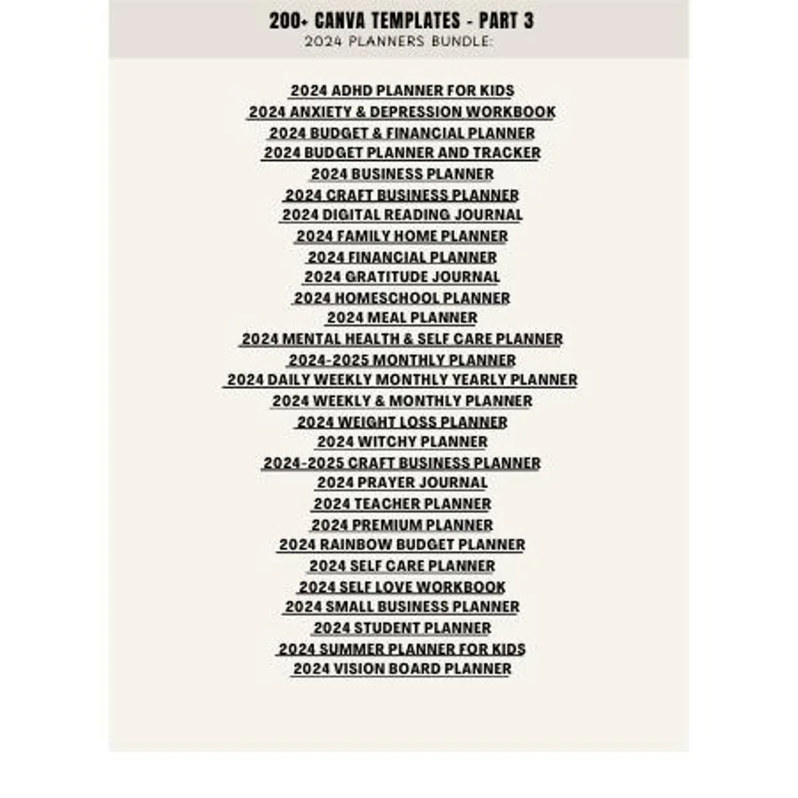 All resources are organized and delivered via PDF files with direct Canva access links.